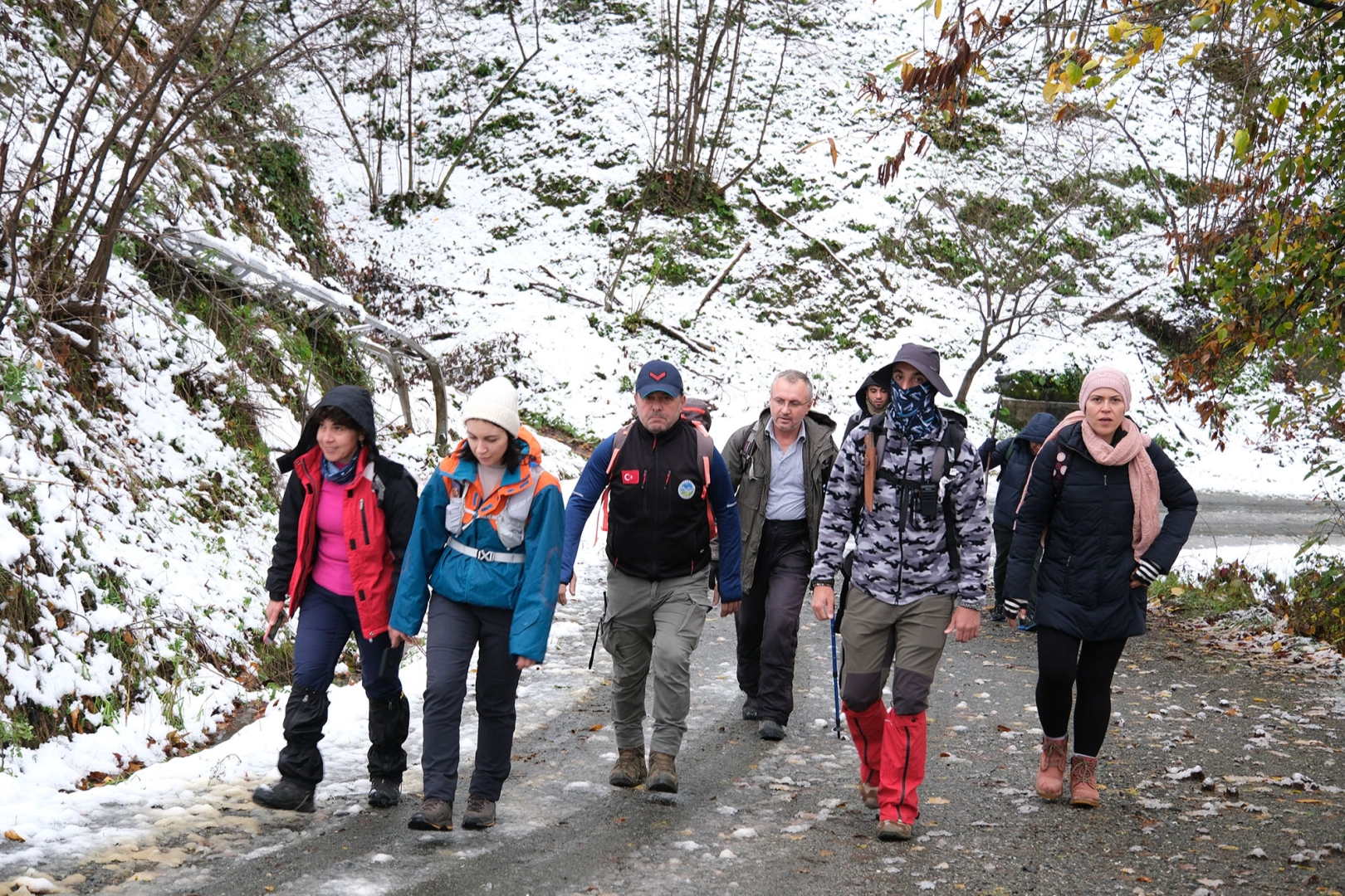 Yoğun kar yağışının etkili olduğu saatlerde gerçekleşen yürüyüş farklı bir keyifle, güzellikle geçti. Tabiat tutkunları hem sonbaharın güzelliğini yaşadı hem de mevsimin ilk karının heyecanıyla yürüdü.