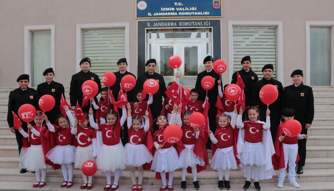 İzmir’in Gaziemir ilçesinde Türk bayraklı tişörtleriyle anlamlı bir görüntü oluşturan minikler, öğretmenlerinin eşliğinde İstiklal Marşı’nın 10 kıtasını ezberleyerek gururla seslendirdi. Bu anlamlı ziyaret sırasında Tümgeneral Metin Düz, öğrencilere çeşitli hediyeler takdim ederek onları tebrik etti. Ziyarette Jandarma Motosikletli Trafik Timleri ve İzmir Atlı Jandarma Tim Komutanlığı’na bağlı ekipler öğrencilere eğitim verdi.