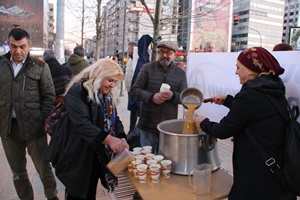 Kadın Kolları tarafından evde pişirilen çorba kazanla meydana getirildi ve burada sıcak sıcak yoldan geçenlere ikram edildi.